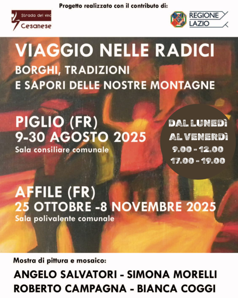 Nel suggestivo borgo di Piglio, dal 9 al 30 agosto 2025, prenderà vita l’esposizione artistica facente parte dell’iniziativa culturale “Viaggio nelle radici: borghi, tradizioni e sapori delle nostre montagne”, un progetto realizzato dall’Associazione per la Gestione della Strada del Vino Cesanese grazie al contributo della Regione Lazio, curato e avviato già durante la presidenza di Antonio Borgia.