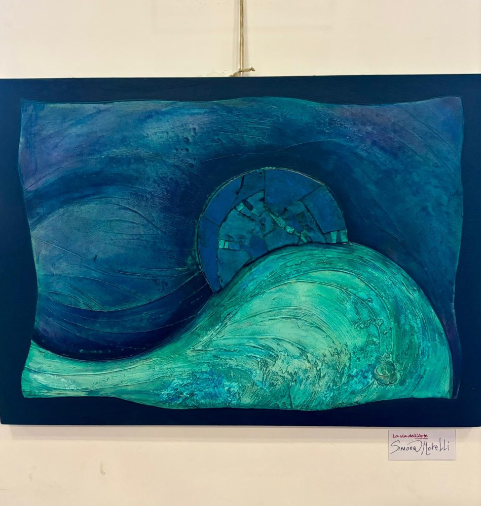 • Simona Morelli, scultrice, pittrice e decoratrice propone opere pittoriche arricchite da inserti in mosaico e stucco in rilievo. I suoi lavori, contemplativi e poetici, giocano con materiali e stratificazioni cromatiche per creare un impatto visivo ed emotivo unico.