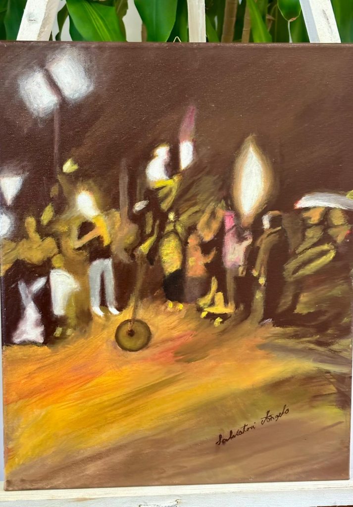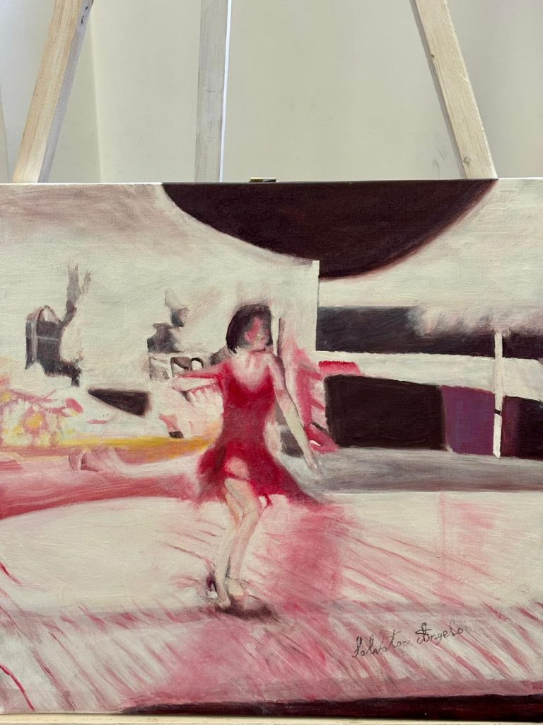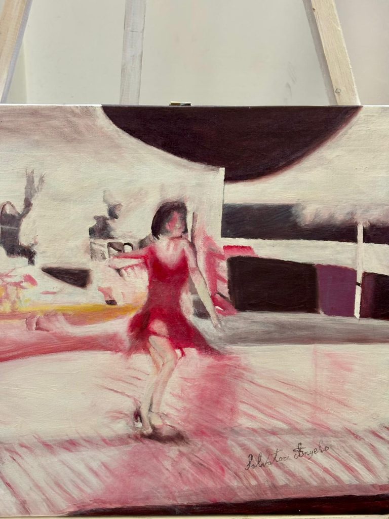 • Angelo Salvatori presenta opere ad olio appartenenti al ciclo “Movimento ottico”, dove luci, ombre e pennellate fluide ricreano scene evocative e dinamiche ispirate alla vita e ai ricordi dell’artista. I suoi lavori rimandano alla pittura impressionista e a maestri come Hopper, Rothko e Munch.